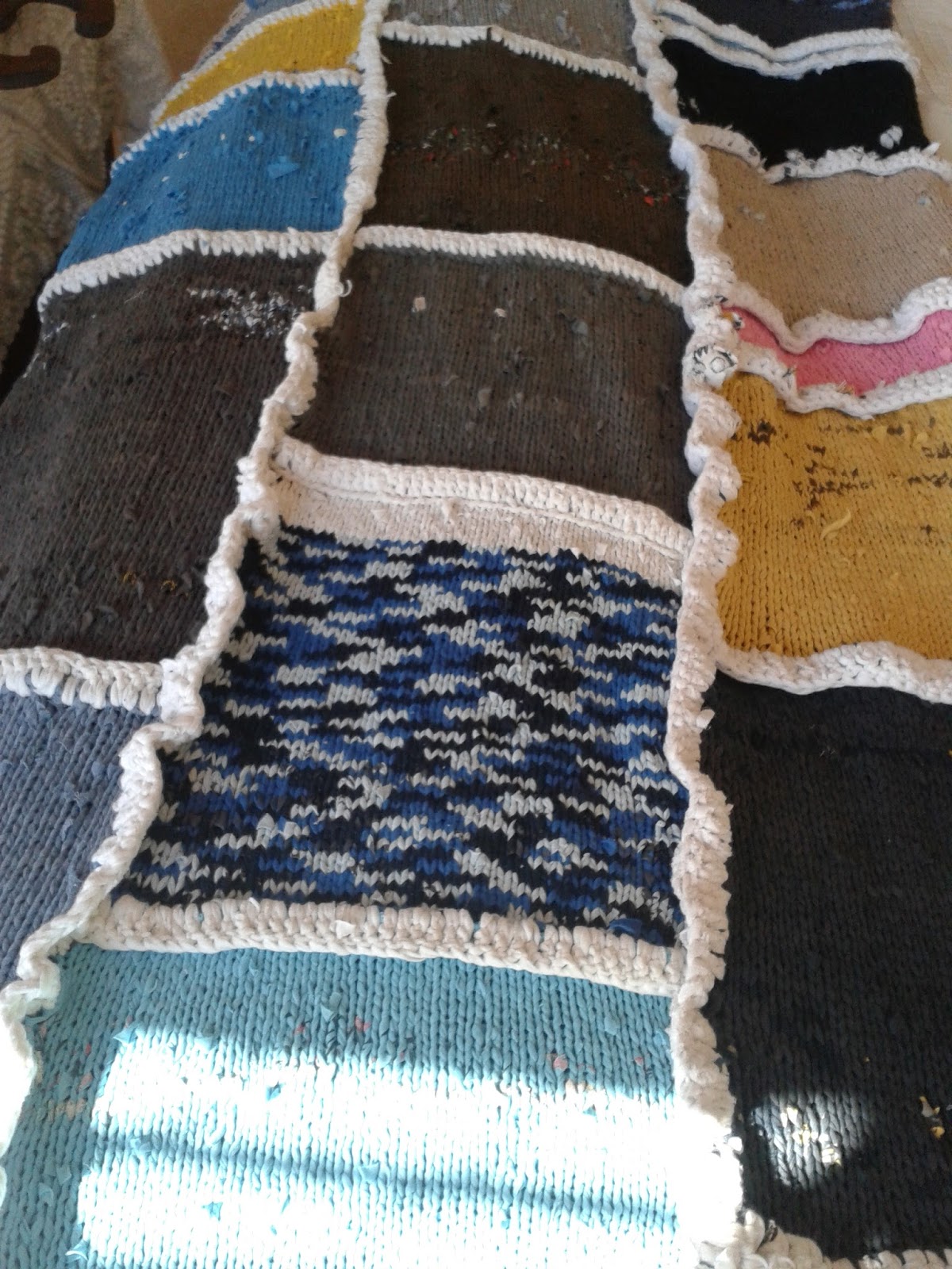 I did the quilt as previously posted and had been busy with this one for some time. I think this one could have taken much quicker if I had a lot of t-shirts to work from right from the start, but after cutting a few old ones, I had to wait again for others to be thrown out! But I am much more clever now....from now on I am going to cut all the old t-shirts and roll it into balls so that the next time I want to do something like this, I have some saved up!